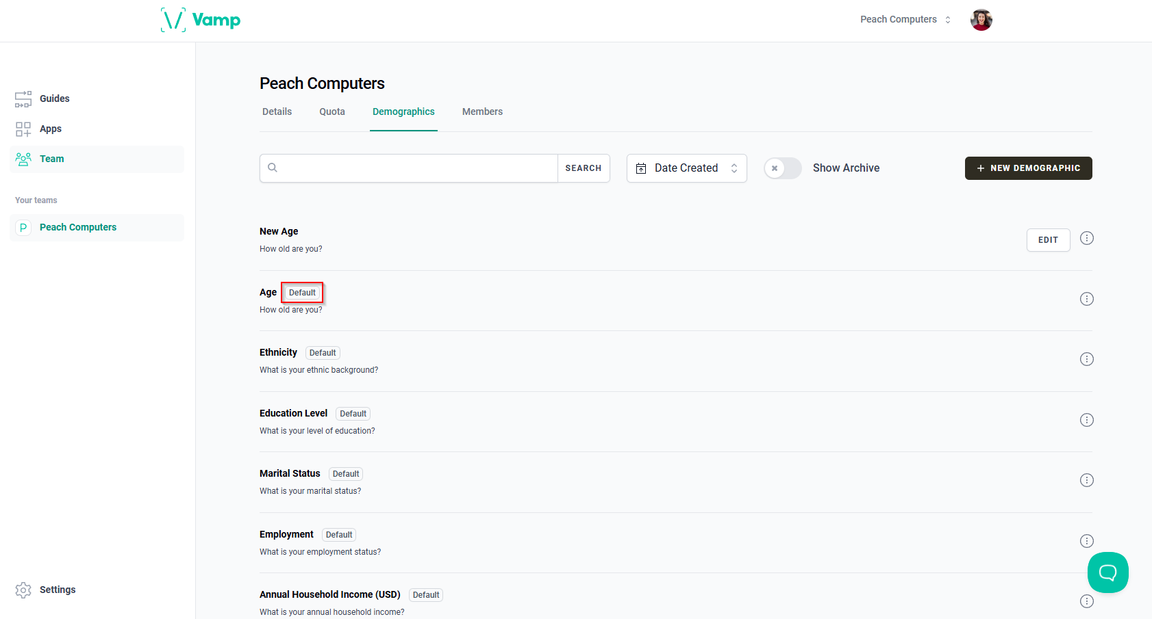 Editing demographics in Vamp allows teams to keep participant data up to date as project needs evolve. With the demographics tab, custom demographic options can be quickly updated to reflect new requirements or refinements.